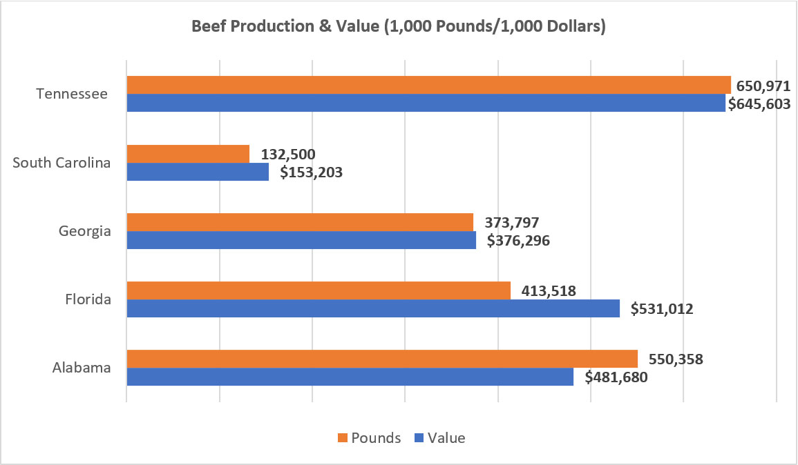 Cattle and calves are important commodities for Southeastern states. In 2022, Tennessee led the region in production and value with more than 650 million pounds at more than $645 million. Alabama, Florida, Georgia, and South Carolina followed.