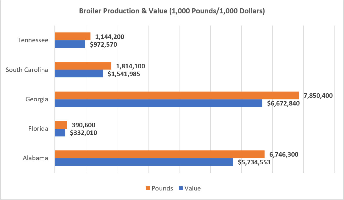 In 2022, Georgia was second only to Arkansas in broiler production. At almost eight billion pounds, Georgia produced 13% of U.S. broilers for a total value of almost $7 billion. Alabama contributed 6.7 billion, which was more than 11% at close to $6 billion in value. Florida, South Carolina, and Tennessee contributed significantly less.