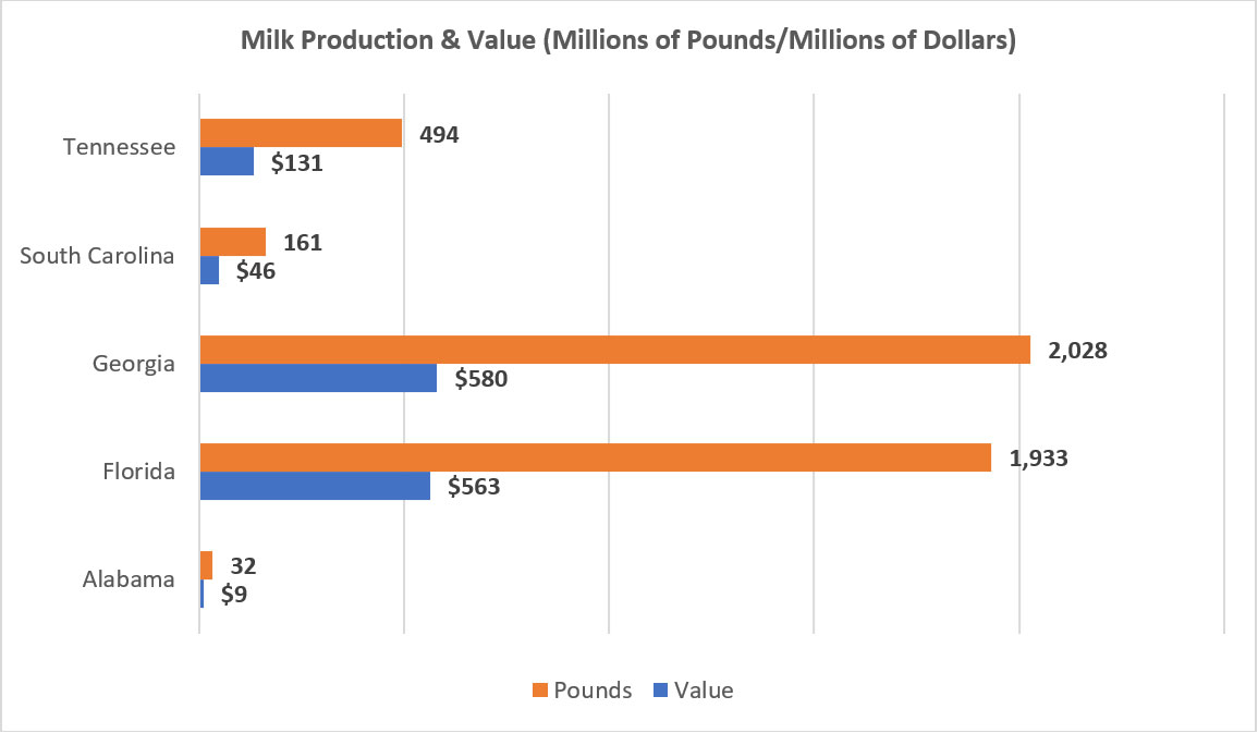 In 2022, the Southeast produced almost 2% of the nation’s dairy at 4.1 billion pounds. Georgia and Florida ranked first and second in the region for both production and value.
