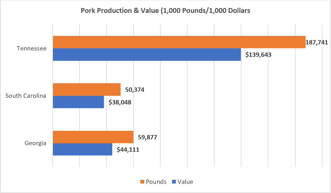 While pork isn’t produced to the same extent as beef in the Southeast, three states contributed significant value and production to the pork market in 2022. Tennessee led the region with close to 188 million pounds valued at $139.6 million. Georgia and South Carolina contributed almost 60 million pounds and just over 50 million pounds, respectively.