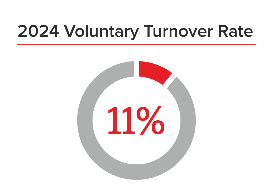We attribute our ability to attract and retain talent to several factors, including impactful work that affects the communities in which our employees live, strong leadership, availability of career advancement opportunities and competitive and equitable total rewards. Our voluntary turnover rate for 2024 was 11%.