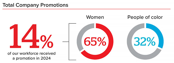 Internal promotions are prioritized, with 45% of new positions filled by existing team members. Approximately 14% of our work force received a promotion in 2024, consisting of 65% women and 32% people of color.