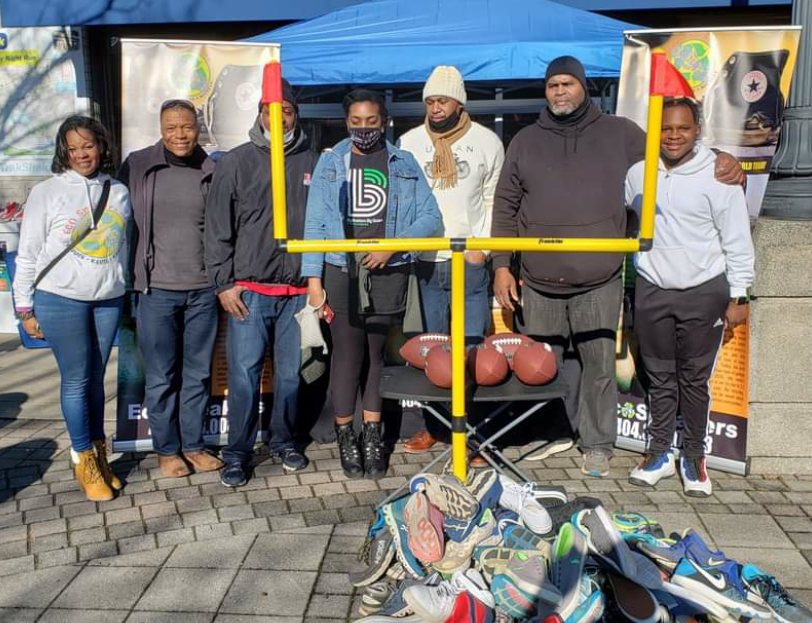 Royd stands with a Big Brothers Big Sisters representative and former NFL players during the Spike your Sneaks Birmingham event.
