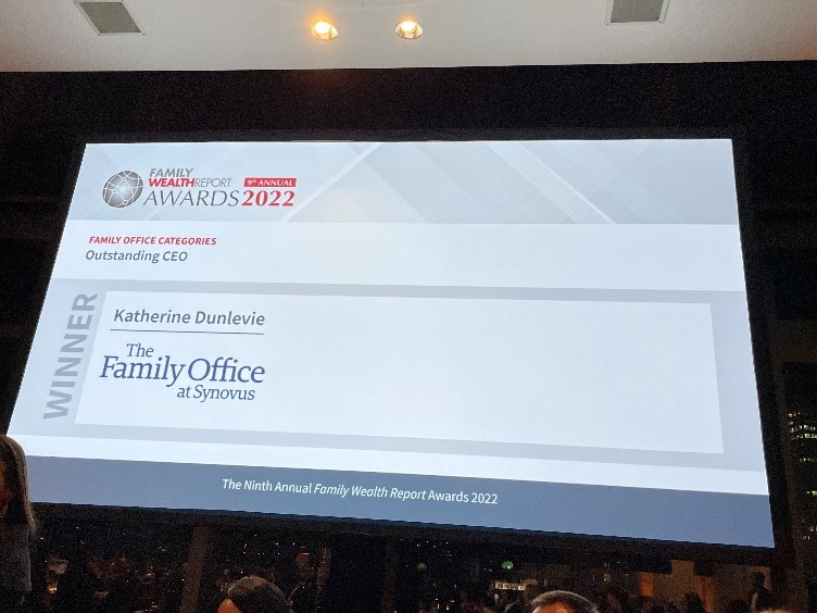 COLUMBUS, Ga., May 12, 2022 — Synovus Bank is pleased to announce that Katherine Dunlevie, president and CEO of The Family Office at Synovus, was named Outstanding CEO during the 9th annual Family Wealth Report Awards on Wednesday, May 4, 2022. The Outstanding CEO award recognizes an inspirational CEO leading a multi-family office of any size.