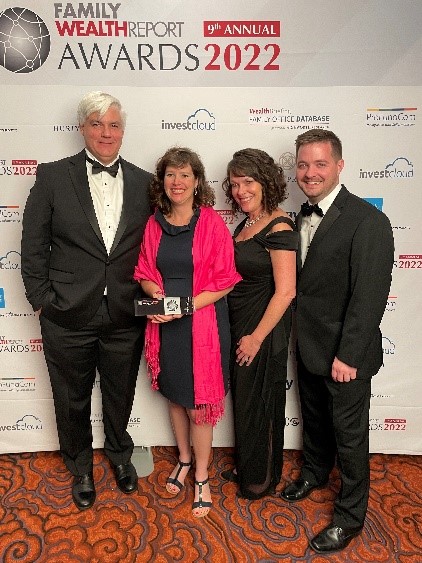 Senior Vice President and Chief Investment Officer Michael Sluder, Private Wealth Management Senior Director Konda Pollard, and Senior Vice President and Chief Operating Officer Michael Clark stand with Katherine Dunlevie following the 9th annual Family Wealth Report Awards presentation.