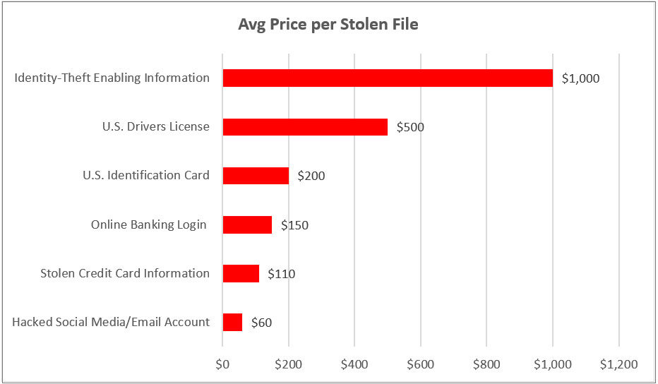 Many small businesses lack cybersecurity resources, which makes it easier for fraudsters to exploit them. For instance, 87% of small businesses store customer information and 27% collect credit card data that they don’t protect.6 Fraudsters use stolen data for various criminal enterprises, most commonly selling it on the dark web. Figure 1 illustrates average sales prices for basic stolen data.