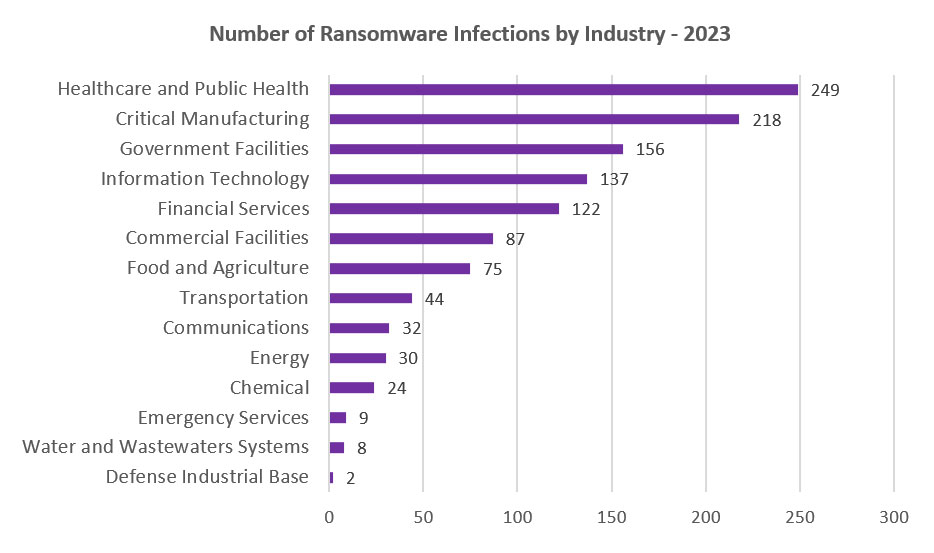 In 2023, healthcare (including public health) was the most targeted industry of all sectors attacked (see Figure 1). Critical manufacturing, which includes transportation, energy, water and utility systems and the government sector followed. Manufacturers, along with technology companies are targeted for proprietary intellectual property such as patents and processes. Financial services companies are obvious targets for consumer and business transactional data.