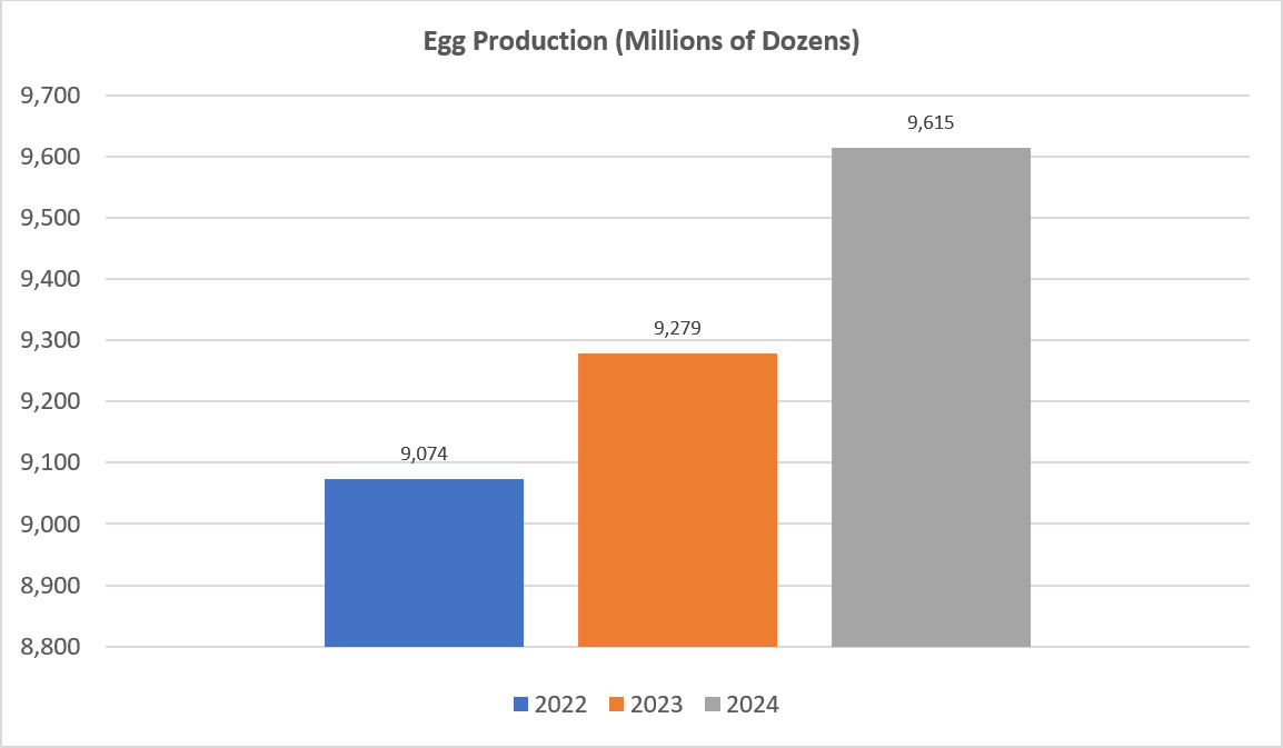 The U.S. produced a little over 9 billion eggs in 2022. Georgia produced 5.2 billion table eggs in 2022. Alabama contributed 2.6 billion, followed by South Carolina at almost 1 billion, and Tennessee at 366 million.5