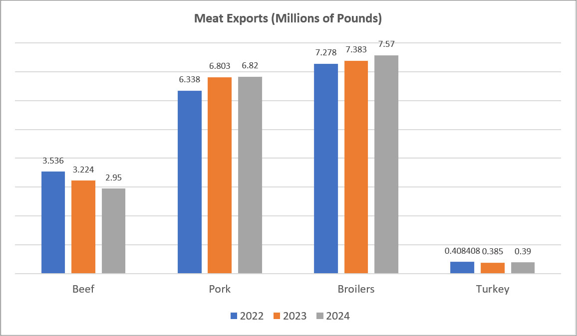 While pork isn’t produced to the same extent as beef in the Southeast, three states contributed significant value and production to the pork market in 2022. Tennessee led the region with close to 188 million pounds valued at $139.6 million. Georgia and South Carolina contributed almost 60 million pounds and just over 50 million pounds, respectively.