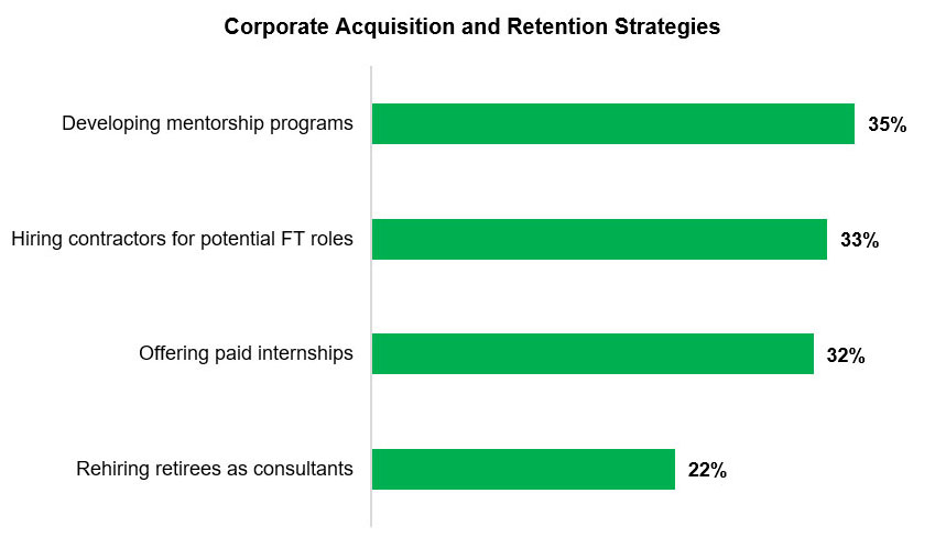 To help meet business objectives, organizations are implementing skills-based recruitment methods to attract highly experienced, motivated workers. These efforts include mentoring programs, hiring former employees as consultants and paid internships.