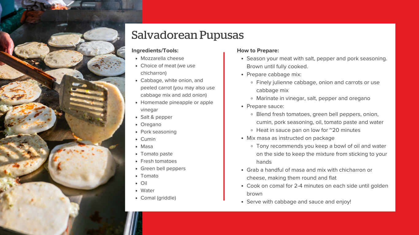 When times were hard for us, my mom made pupusas to brighten our day and it always did! Mom shared stories from her childhood about making pupusas with my Abuela and then passed the recipe down to us. By passing down this part of our culture, she taught me how to make pupusas, too, to an extent.