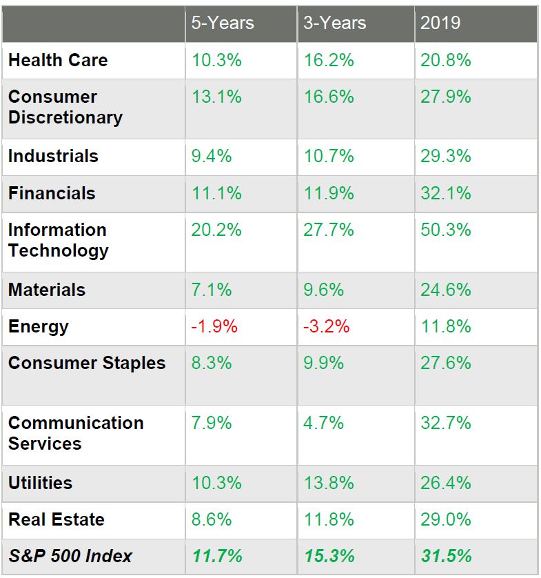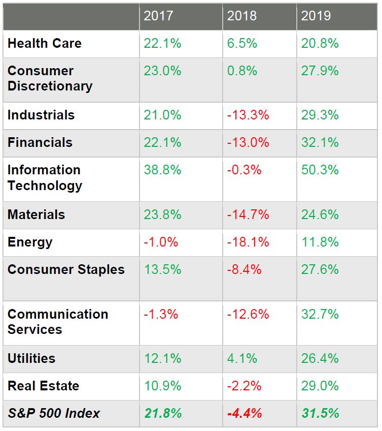 Here are the sector returns for each of the past 3 years through December 31, 2019: