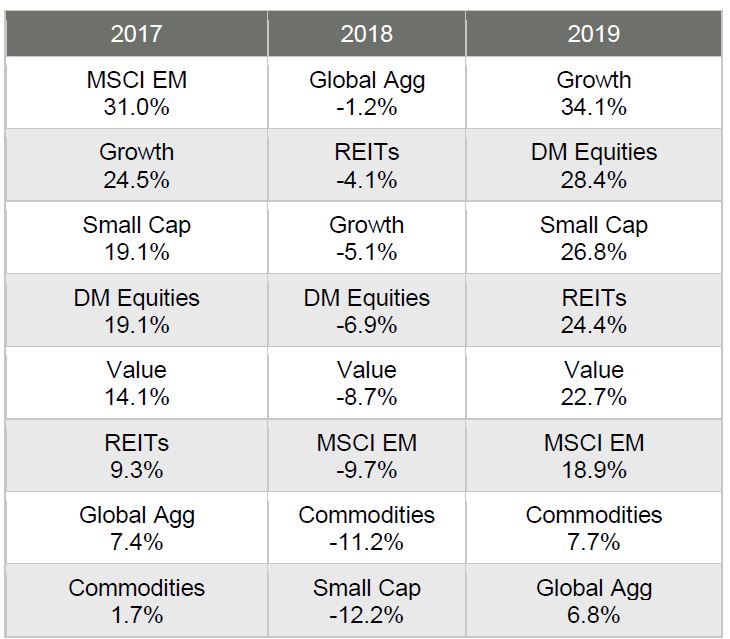 Source: Bloomberg Barclays, FTSE, MSCI, Refinitiv Datastream, J.P. Morgan Asset Management. DM Equities: MSCI World; REITs: FTSE NAREIT Global Real Estate Investment Trusts; Cmdty: Bloomberg Commodity Index; Global Agg: Barclays Global Aggregate; Growth: MSCI World Growth; Value: MSCI World Value; Small cap: MSCI World Small Cap. All indices are total return in US dollars. Data as of December 31, 2019.