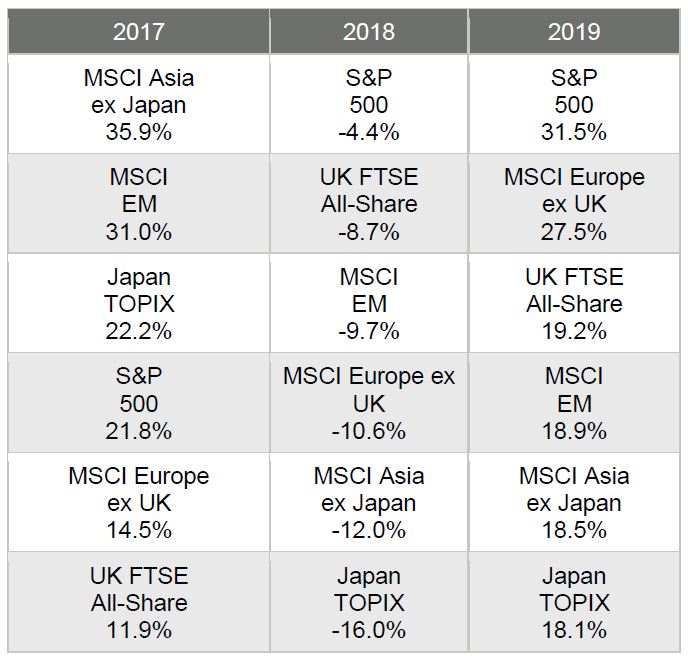 Source: FTSE, MSCI, Refinitiv Datastream, Standard & Poor’s, TOPIX, J.P. Morgan Asset Management. All indices are total return in local currency, except for MSCI Asia ex-Japan and MSCI EM, which are in US dollars. Data as of December 31, 2019.