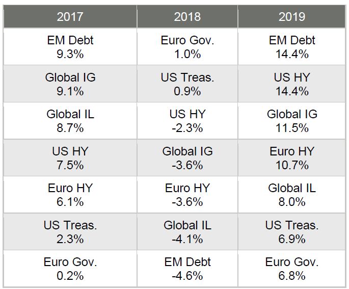 Source: Bloomberg Barclays, BofA/Merrill Lynch, J.P. Morgan Economic Research, Refinitiv Datastream, J.P. Morgan Asset Management. Global IL: Barclays Global Inflation-Linked; Euro Gov.: Barclays Euro Aggregate Government; US Treas: Barclays US Aggregate Government - Treasury; Global IG: Barclays Global Aggregate - Corporates; US HY: BofA/Merrill Lynch US HY Constrained; Euro HY: BofA/Merrill Lynch Euro Non-Financial HY Constrained; EM Debt: J.P. Morgan EMBIG. All indices are total return in local currency, except for EM and global indices, which are in US dollars. Data as of June 30, 2019.