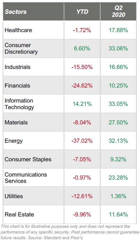 Reviewing the sector returns for the second quarter and YTD through June 30, 2020, we saw that: