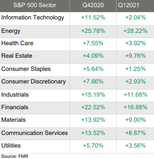 Reviewing the sector returns for just the first quarter of 2021, we saw that: