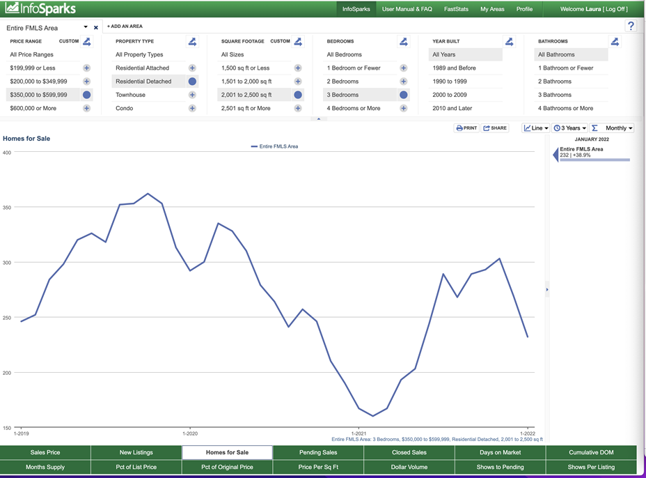 In the downsize category (sales price of $350,000 to $599,000, detached homes of 2,001 to 2,500 square feet with three bedrooms), there were 292 homes for sale in January 2020, 167 in January 2021, and 232 in January 2022.6