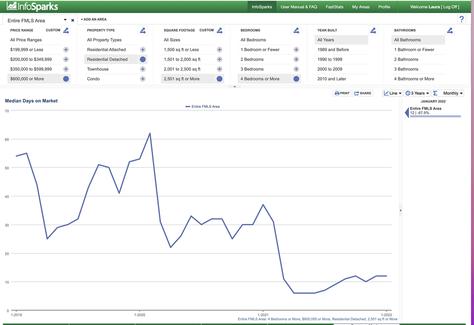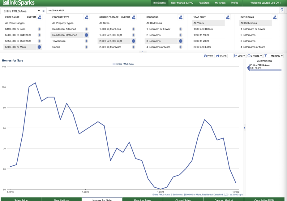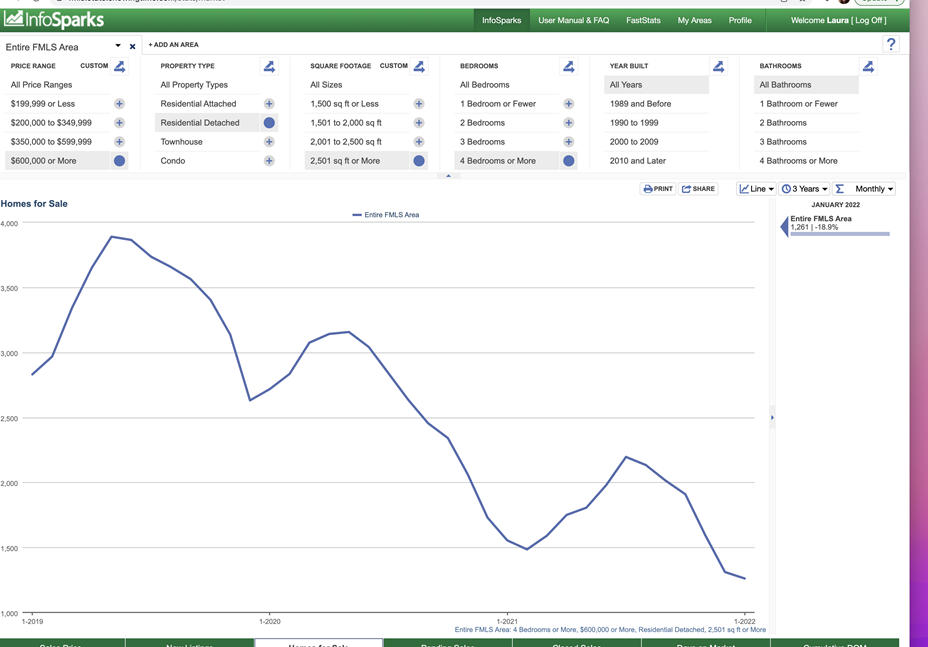 If you keep the smaller size but go up in price to the luxury category of a sales price of $600,000 or more, there were 79 homes for sale in January 2020, 50 in January 2021, and 53 in January 2022.6