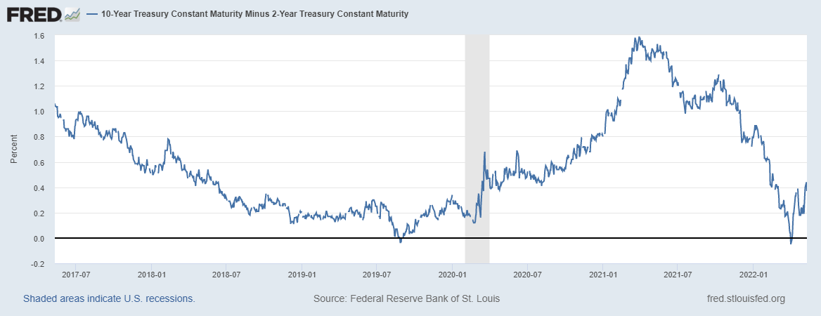 The following chart shows the spread between the inflation expectations built into 10-year and 2-year treasuries. The fact that it is in negative territory suggests the market thinks that inflation may fall, and this may also explain why yields on longer-dated treasuries are lower than on shorter-dated ones. And although inflation would fall in the event of an economic slowdown or recession, there could be a situation where inflation fell but the economy remained buoyant. Hence a yield curve inversion doesn’t have to mean that we are up against an imminent recession.