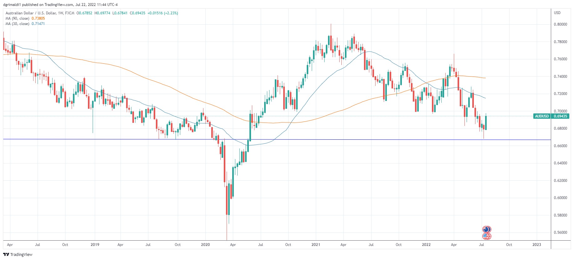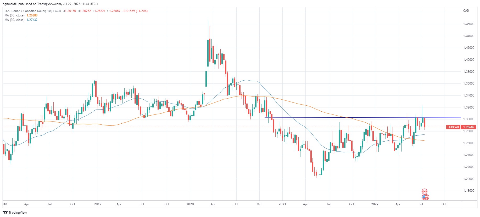 Inflation in the United Kingdom headed toward 10% as the oil crunch and supply chain woes make a costly impact. The Bank of England (BoE) raised rates for the fifth time and now some of the more hawkish members want faster rate hikes. At the last policy meeting in June, the BoE is prepared to act more forcefully to tame inflation. Prime Minister Boris Johnson has resigned as PM and will step down once a replacement is found. Investors are betting on a rate hike of 50bp in August to 1.25%. That could change now that the Bank of Canada has hiked 100bp and the Fed is rumored to do likewise. From a technical standpoint, GBP prices have now broken down since April and are starting to make some separation from the moving averages. On the monthly chart it looks like a close below 1.2160 would accelerate prices to the downside and could target 1.1300 area that held during Brexit in 2015 and COVID in March 2020.