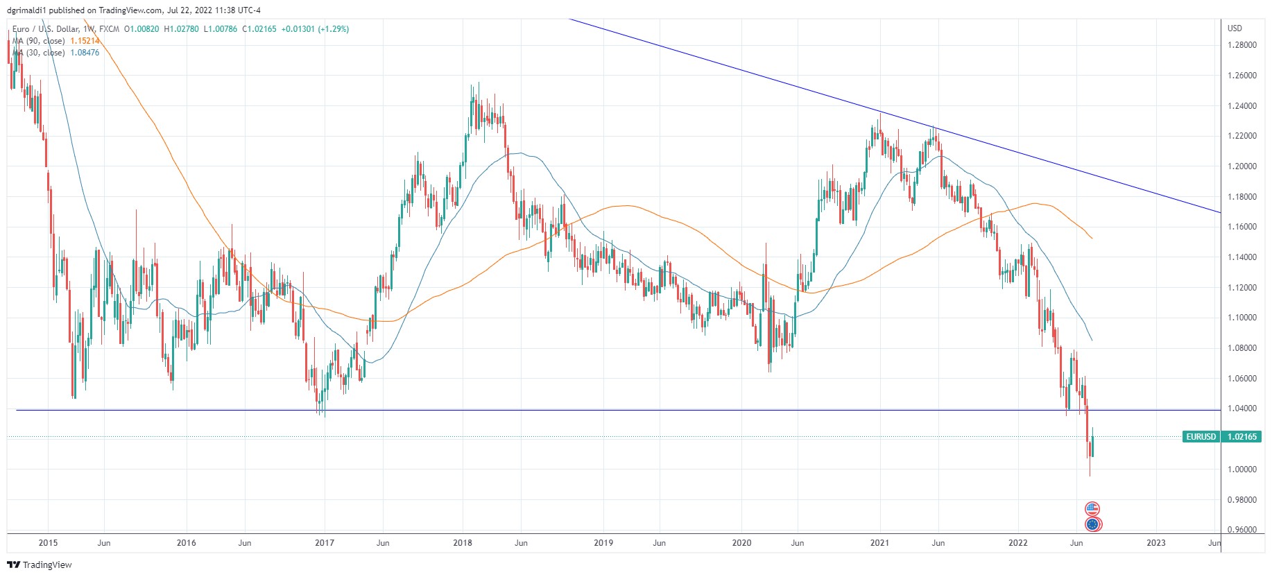 Despite weakening demand from a cyclical slowdown, Central Banks are aggressively attempting to curb inflation by hiking rates. The Federal Reserve changed course from 50 basis points (bp) to 75bp in June after inflation came in hotter than expected. The Swiss National Bank and the Reserve Bank of Australia also raised rates higher than expect at 50 bp. The European Central Bank (ECB) not be outdone looks to be joining the party as the market is now priced in 100bp of hikes into year-end. The Bank of England was more measured at 25bp but warned of more dramatic hikes if necessary. The Bank of Canada raised rates 100bp in July. Only the Bank of Japan is maintaining “extremely low interest rates.” Currencies have recovered against the U.S. Dollar as a result. Calls for 100bp hike in July followed the strong June U.S. jobs report, Consumer Price Index (CPI) at 9.1%, and comments by the Federal Reserve that believes that a tight job market can withstand additional hikes. Regardless, the medium-term trend for U.S. Dollar strength is intact, and could continue after the Fed meets in July and decides to raise another 75bp or 100bp. During the editing of this outlook, EUR/USD was 1.0600 and sunk 5.6%, requiring an entire re-write to my view. The market now will focus on GDP growth (or negative growth) along with inflation for clues on what the Fed will do going forward. Even a small negative GDP number may be enough to keep the Fed on track to be more aggressive in fighting inflation. Another negative quarter of growth would be a recession and may ultimately lead to political pressure to decrease hikes. Vladimir Putin is taking a more measured approach to the Ukraine War and has begun a new bombing campaign of Kiev. Russia has lost so many generals during the conflict that Putin has pulled one off the retirement bench to lead the conflict. The “media talking heads” think Putin will be satisfied with annexing only the Donbas region, his actions seem to indicate he is dug in for the long haul. Putin is facing very little pressure from citizens, and oil is still very affordable there, unlike the rest of the world. This should keep downward pressure on EUR for the foreseeable future.
