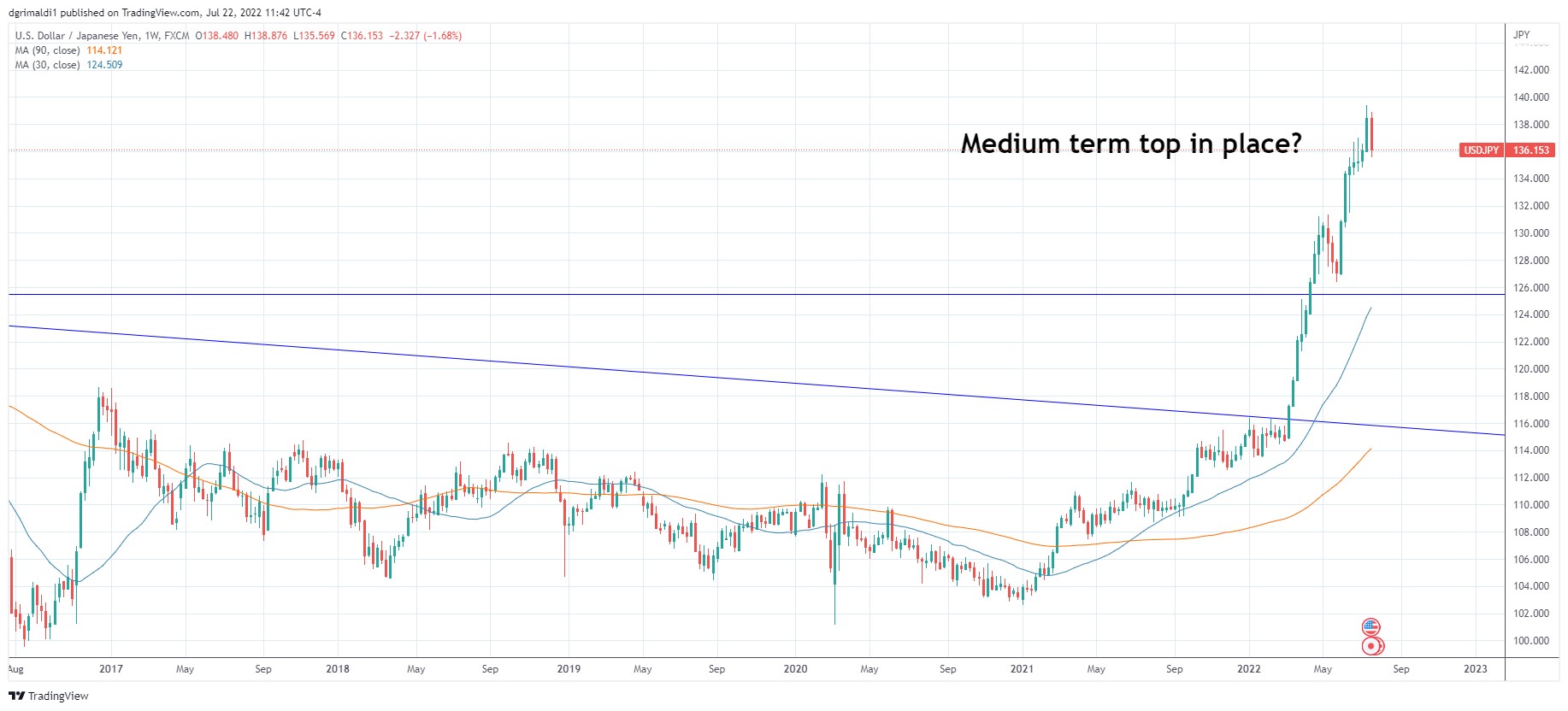 EUR/USD has broken support now 1.0325-50 and traded to parity on July 12. The summer months are normally very quiet for FX activity, but these are not normal times. After a good U.S. Labor report the market seems convinced of a more aggressive Fed, and recession in Europe. The technical bearish call I have held to since September 2021 is still performing well and should continue unless the U.S. goes into a recession. Pricing is getting further from moving average, which should provide good selling opportunities on rallies. I would expect 1.0800 now to hold this year on rallies. The break below 1.0300 brought more selling pressure and as will a break of 1.0000. Downside target now is .9325 and .8900 channel support. The Ukraine War is far from over, and we should not underestimate the atrocities Putin will inflict to capture areas they retreated from earlier this year.