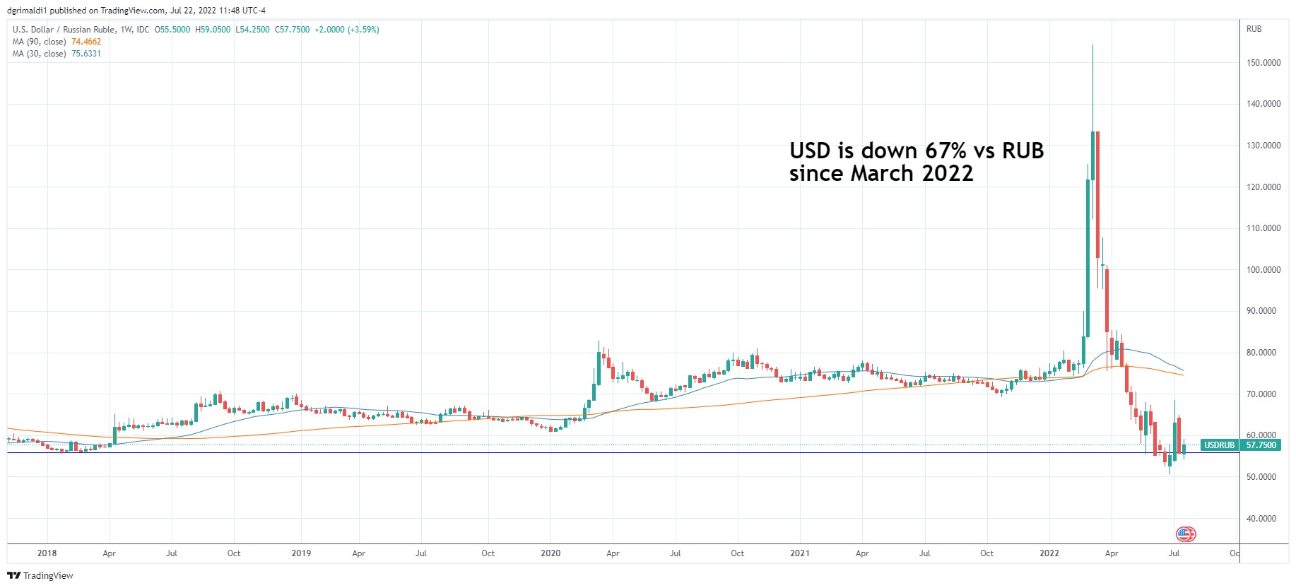 I thought it was worth looking at this chart because what you see on the news does not reflect what is really going on in Russia. Russians are paying $3.54 per gallon for gas compared to $5.00 in the U.S.1 China and India are happy to take Russian gas and pay in rubles. India has received 34 million barrels of discounted Russian oil since Moscow invaded Ukraine on Feb. 24, according to Refinitiv Eikon data, more than tripling the value of total imports from Russia, including other products, compared with the same period of 2021.2 Ruble has risen as the Russians have been more methodical (and violent) in Ukraine and look like they will fulfill early predictions of victory, despite how much money we dangerously dump to support Ukraine. The ruble has fallen below levels from 2018. Banks are forbidden to speculate in Rubles, so the price reflects only the demand side for purchasing oil. The Russian citizens are not suffering from all the boycotts from Western companies, and public opinion has majority support in Putin. SWIFT sanctions never had any teeth as transactions continue to take place between Western and Russian banks. European leaders pledge to end Russian gas purchases this year, which looks to do more harm to Europe than Russia. Putin is now delivering low gas prices to its citizens, a strong ruble, and selling oil at inflated prices to the rest of the world.