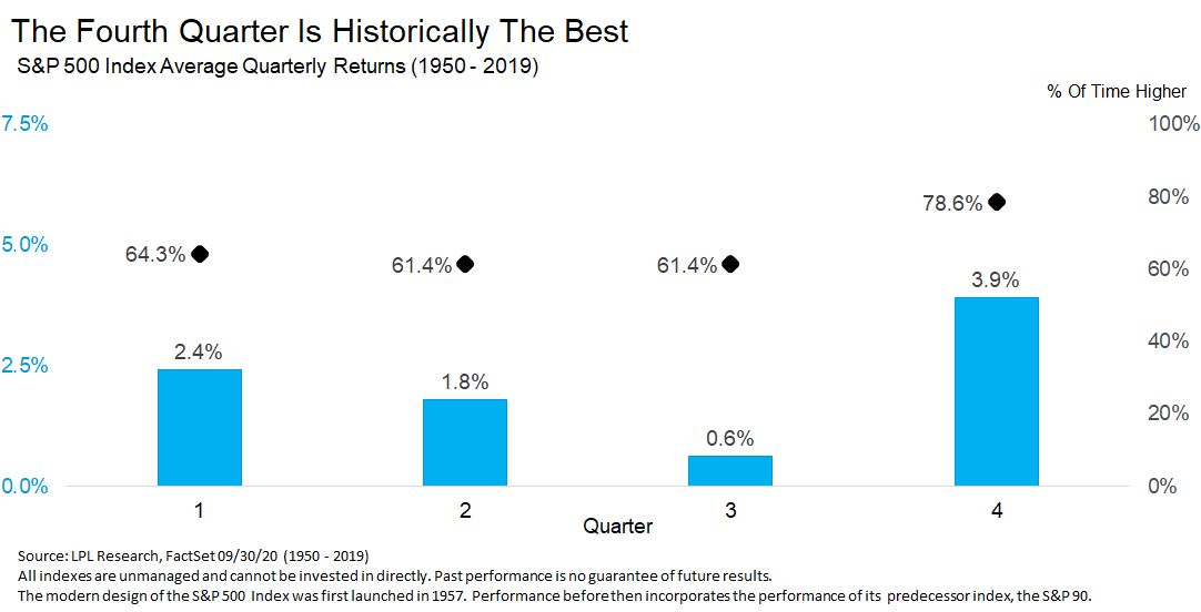 The holiday season is upon us. It can be a time for family, reflection, and positive seasonal market returns for stocks. The S&P 500 is up over 12% from mid-October and up over 8% since the mid-term elections. Historically, the fourth quarter has provided higher returns for the S&P 500 accounting for nearly 80% of the time when measured against all quarterly returns, averaging 3.9% since 1950, also known as the “Santa Claus Rally.”