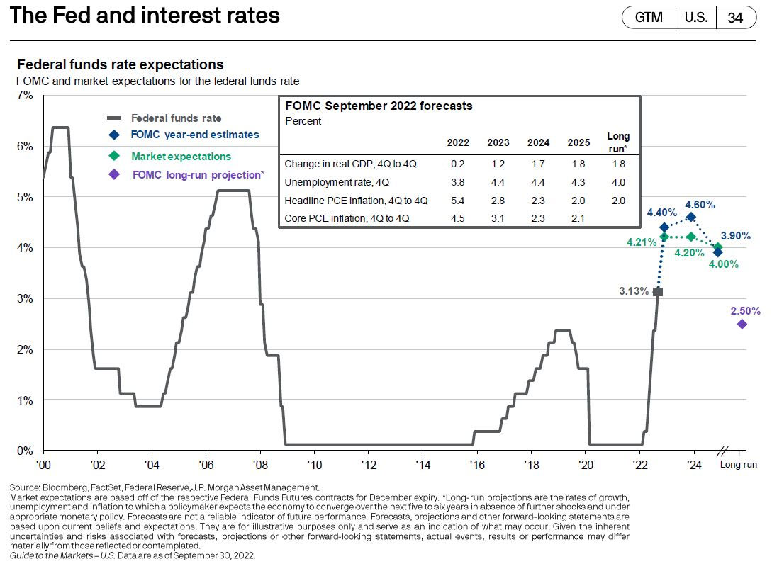 The Federal Reserve is still on track to continue their quantitative tightening, or QT, policy throughout 2022 and into 2023. At this time, the bond market as priced in two additional rate hikes of .50% for over the next two FOMC meetings (Dec. 15 and Feb. 2) bringing the Fed Rate to 4.75% to 5% and an additional .25% rate hike in March 2023. The challenge will be reducing inflation and creating enough consumer demand reduction to lower prices even further into 2023 without pushing the U.S. economy into a recession. The JP Morgan 4th Quarter Guide to the Markets chart maps out the forecasted Fed Funds rate for 2023 through 2025.