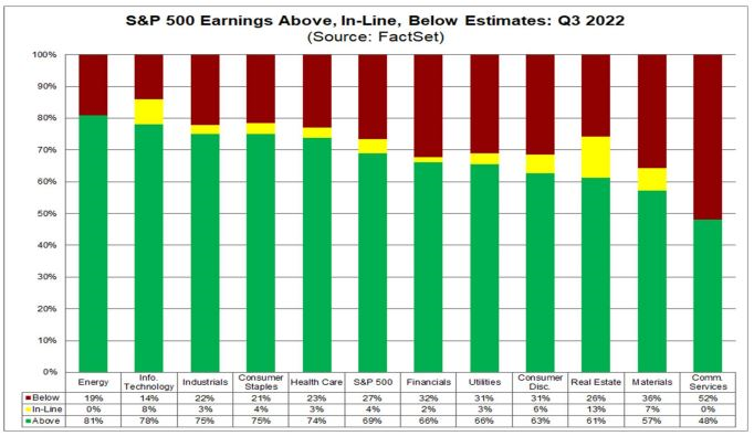 According to the FactSet Earnings Insight report, 94% of the S&P 500 companies reporting Q3 earnings results, 69% of S&P companies have reported positive earnings per share (EPS) and 71% of S&P companies have reported a positive revenue surprise.1 Earnings growth for Q3 was 2.2% and if this growth rate sticks with the rest of the total S&P firms reporting, this will mark the lowest earnings growth in 2 years. For earnings guidance in Q4 2022, or the forecast for future earnings performance, 55 S&P companies have issued negative EPS guidance and 27 S&P companies have issued positive EPS guidance, which provides a bit of a mixed bag of projected performance going into the end of the year.