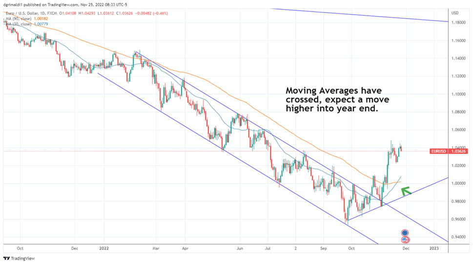 As I wrote in my Q4 update, EUR/USD has notably broken out of the trend channel we have been in since January. It has since broken above my moving average indicators and turned positive. While I was looking for better levels to resell EUR, I have changed that to looking for better levels to BUY EUR. What has changed in a month? Ukraine has reclaimed land lost to the invading Russians and seems to have once again regained momentum in the war. Despite the Ukrainians resistance, there have been more calls for a diplomatic solution, notably from the unusual agreement from far left of the Democratic Party and the GOP. The Europeans seemed to have met many of their goals for natural gas reserves to get them through the winter.