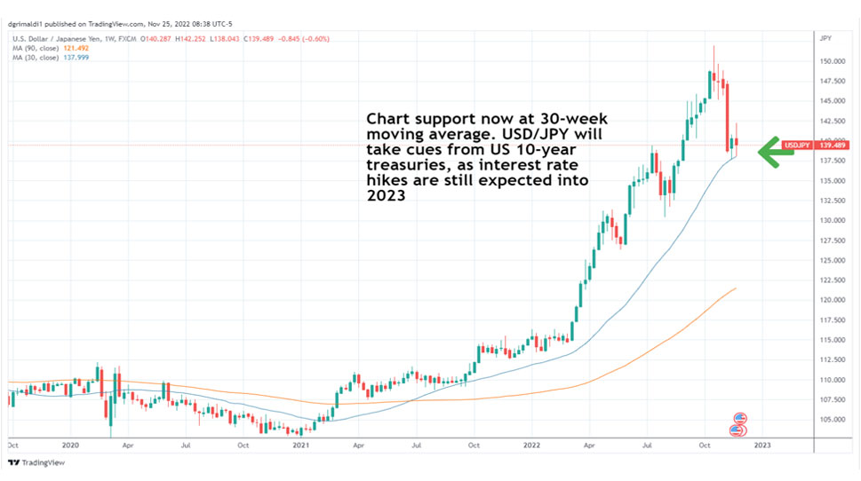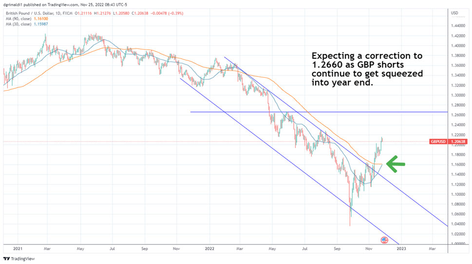 Like the EUR/USD, GBP has seen a significant short squeeze, and has broken the 1.2000 psychological barrier ahead of Thanksgiving. The Daily chart is beginning to look bullish, as market players are anticipating recession in the U.S. and a slowdown in rate hikes. The weight of U.S. policy decisions will take precedent, and though we may see volatility and move lower in GBP, it could be that we have seen the bottom in GBP/USD.