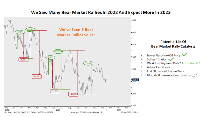 Is the recent strength in the Technology Sector just another head fake that will repeat the same Bear Market Rally cycles we saw in 2022? In 2022 the broader market rallied five consecutive times only to be stamped out each time as another wave of negative news impacted the market. See chart. Will this cycle repeat itself in 2023?