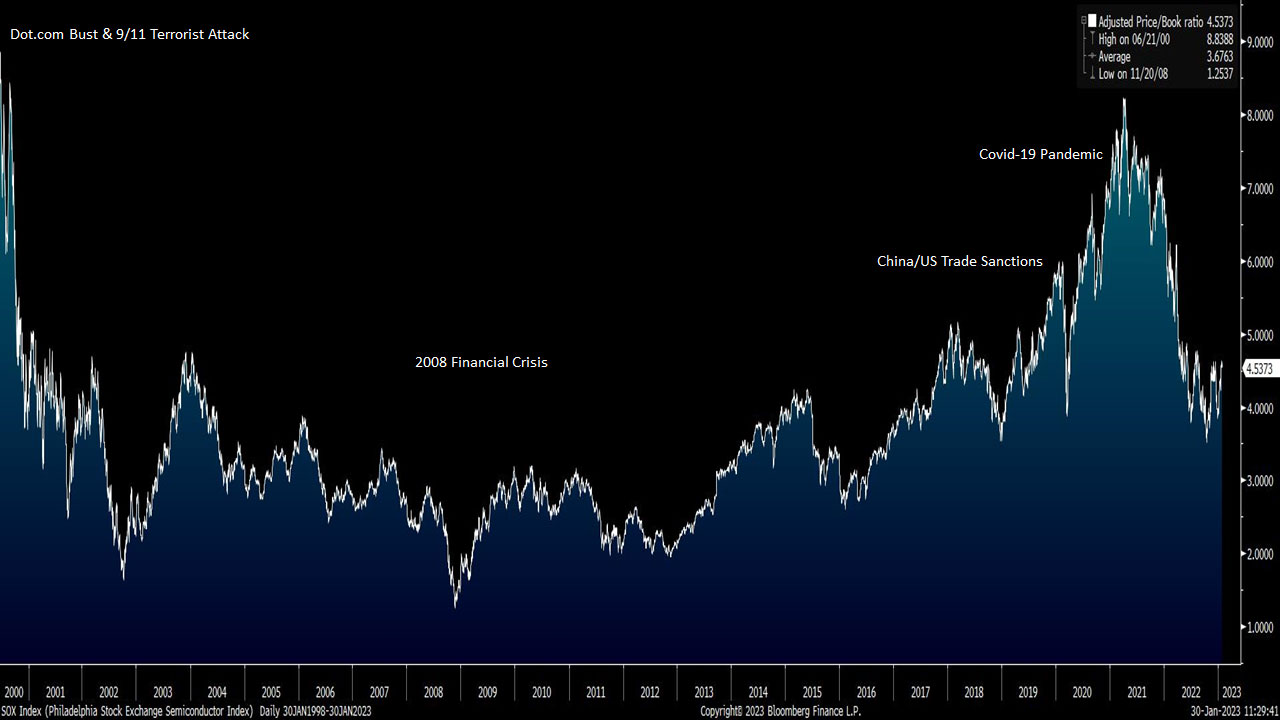 Let’s take a look at the recent boom-to-bust cycles in the chip sector over past 25 years and see if we can determine based on the historical profit valuation metric the price-to-book ratio (P/B) if the sector has truly bottomed out and is poised for a rebound. The P/B ratio is a good metric to judge the valuation of a chip company, as many larger semiconductor companies have built solid balance sheets, with strong cash positions and little or no debt, providing resilience amid an economic slowdown and higher borrowing costs.