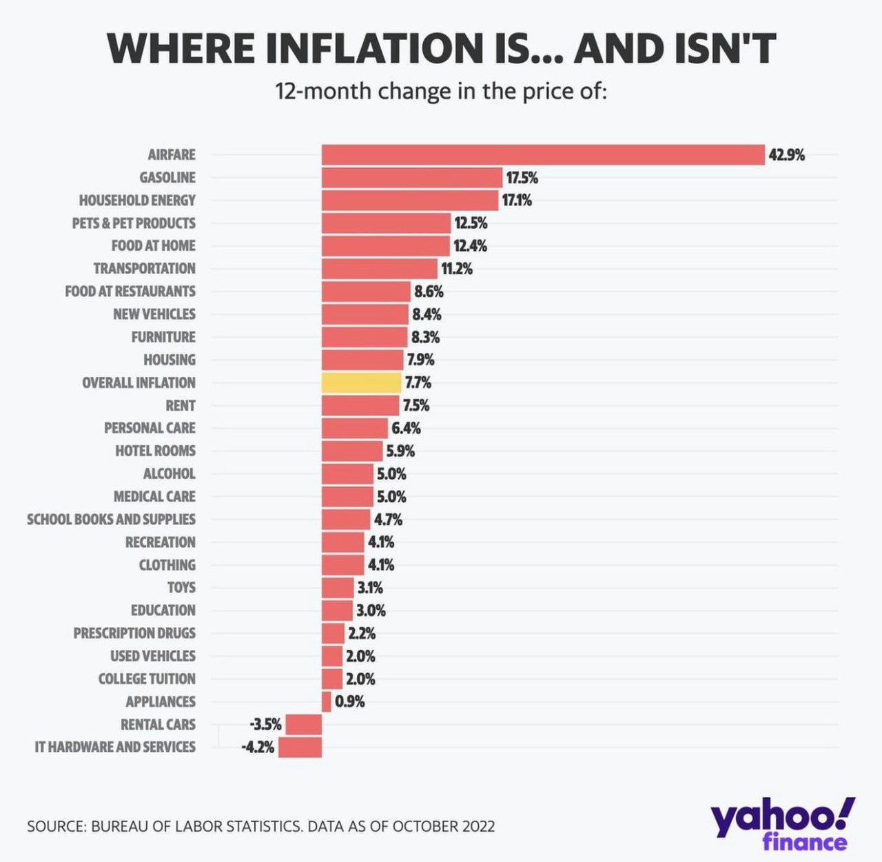 Inflation is easing as supply chains have improved. Though, we have seen a decline in the inflation rate for goods, inflation remains sticky, especially in the services. Yahoo Finance published information last month from the Bureau of Labor Statistics showing where inflation is and isn’t. The year over year (YOY) changes have shown that airfare leads the way with the highest YOY increase followed by gas at the pumps, energy, and pet products.