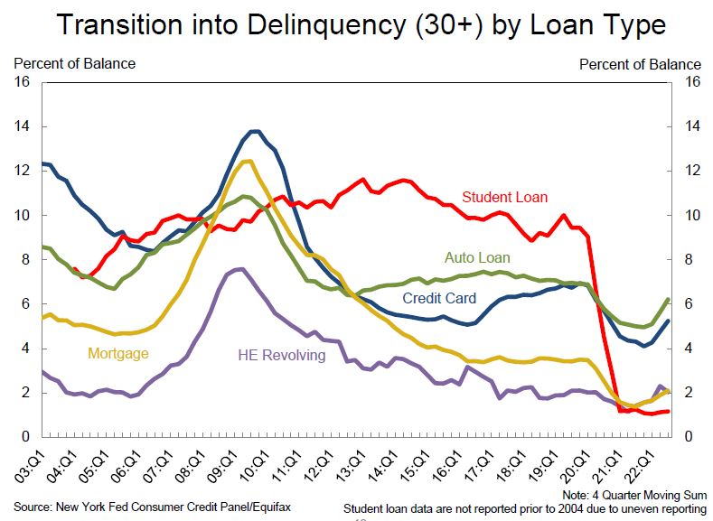 An important area that we are watching that may tip the scales of a soft landing to a full-blown recession will be consumer credit delinquencies. U.S. consumption comprises of just over 2/3 of the U.S. gross domestic product (GDP.) If GDP weakens, we may spot cracks in the foundation of consumer strength through credit delinquencies. The NY Fed publishes a quarterly report on household debt and credit. One interesting chart is the 30+ day delinquencies by loan type. This reading still shows that consumer delinquencies are well below the 20-year average. If we see consumer delinquencies climb beyond the 2005-2007 levels then, this may indicate that consumers may not have the necessary cash on hand to maintain their lifestyle nor the ability to pay their debt obligations.