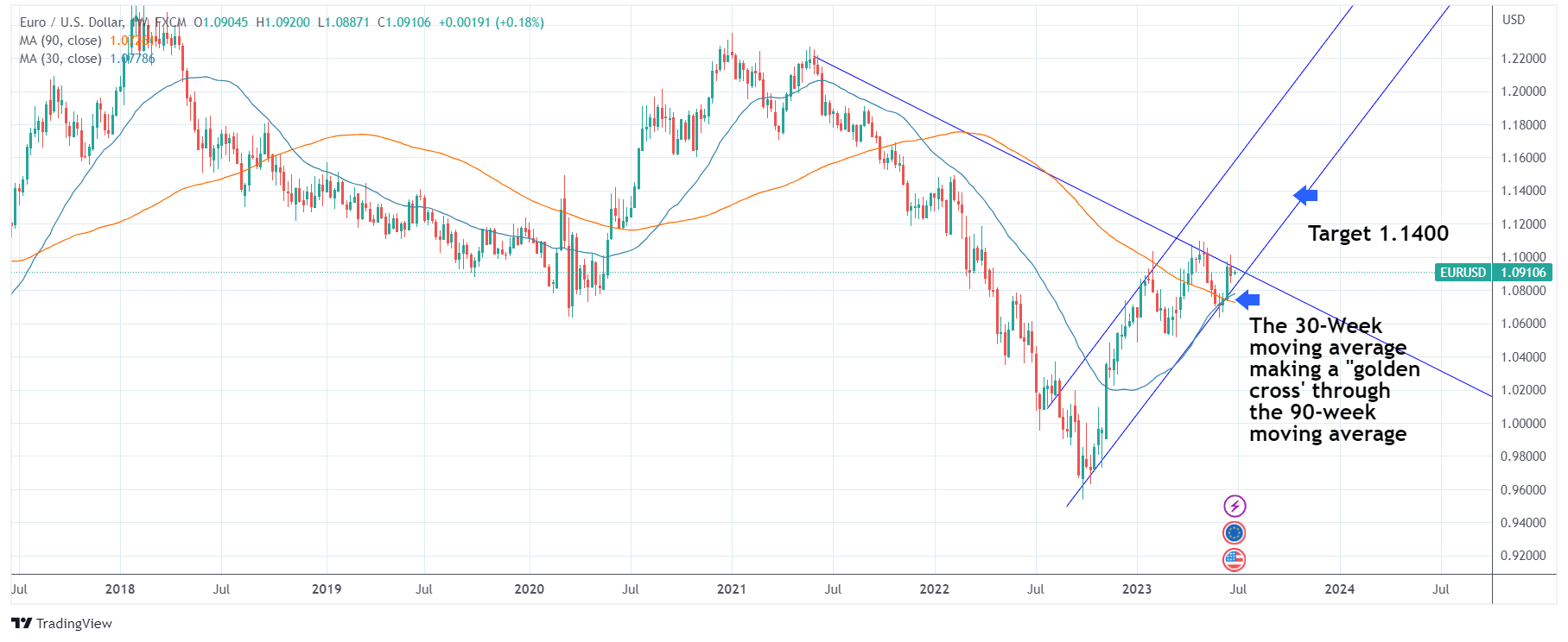 The euro and U.S. dollar (EUR/USD) formed a golden cross, where the 30-week moving average crosses through the 90-week moving average, which is usually a strong signal for a longer term trend. The weekly chart had a bullish candle the second week of June, which may mean a short-term move through key 1.1100 resitance, targeting a move to 1.1400.