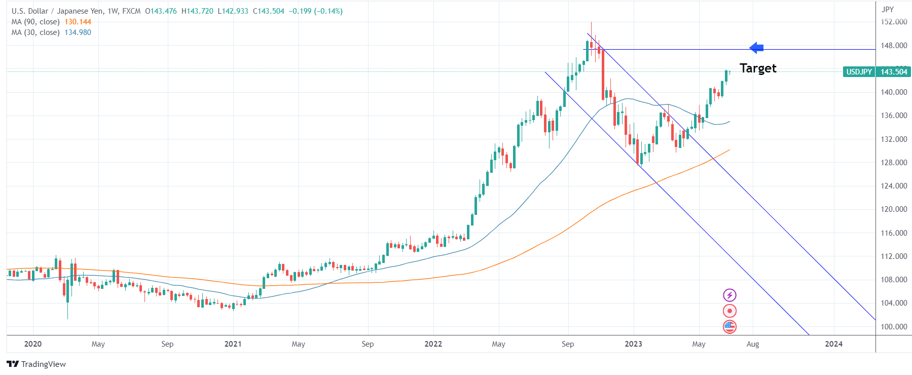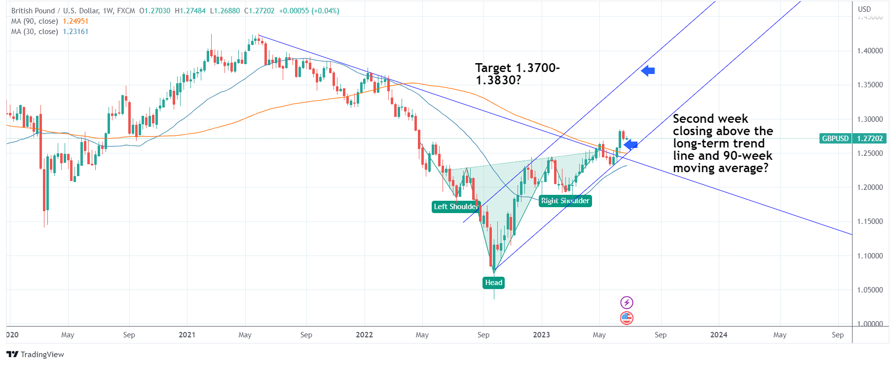 The British pound and U.S. dollar (GBP/USD) has been in an uptrend since October 2022. It retraced from the 1.03 area to 1.24, a 20% increase by January. In April, it formed a reverse head and shoulders pattern, which is usually a setup for a much larger move higher. The U.S. debt ceiling issue put the upward move on pause for six weeks. Now that the debt ceiling is behind the markets, from a technical standpoint it appears that GBP is poised for a much larger move higher. GBP/USD made a weekly close in June above not only the neckline of the head and shoulders, but a close above the long-term down trend line and the 90 period moving average. This could target 1.32 short term and possibly 1.3830 into the year’s end. From a macro standpoint, the United Kingdom (UK) has more sticky inflation issues due to supply chain, energy and Brexit. This will keep the Bank of England vigilant on hiking rates while the U.S. is winding down. The Bank of England, one of the first of the G-7 countries to raise rates, and surpised economists with a 50 bps hike in June, raising rates for the 13th straight consecutive meeting.