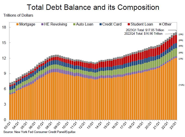 Household debt plays a significant role in a nation’s financial landscape. According to data from the Federal Reserve Bank of New York, as of Q1 2023, the total U.S. household debt stands at $17.05 trillion, up 0.9% from Q4 2022 ($16.9 trillion). This is an increase of $2.9 trillion in total household debt since the end of 2019. The New York Fed’s quarterly report on household debt and credit includes mortgages, home equity revolving line debt, student loans, auto loans, credit card debt and other forms of consumer debt.