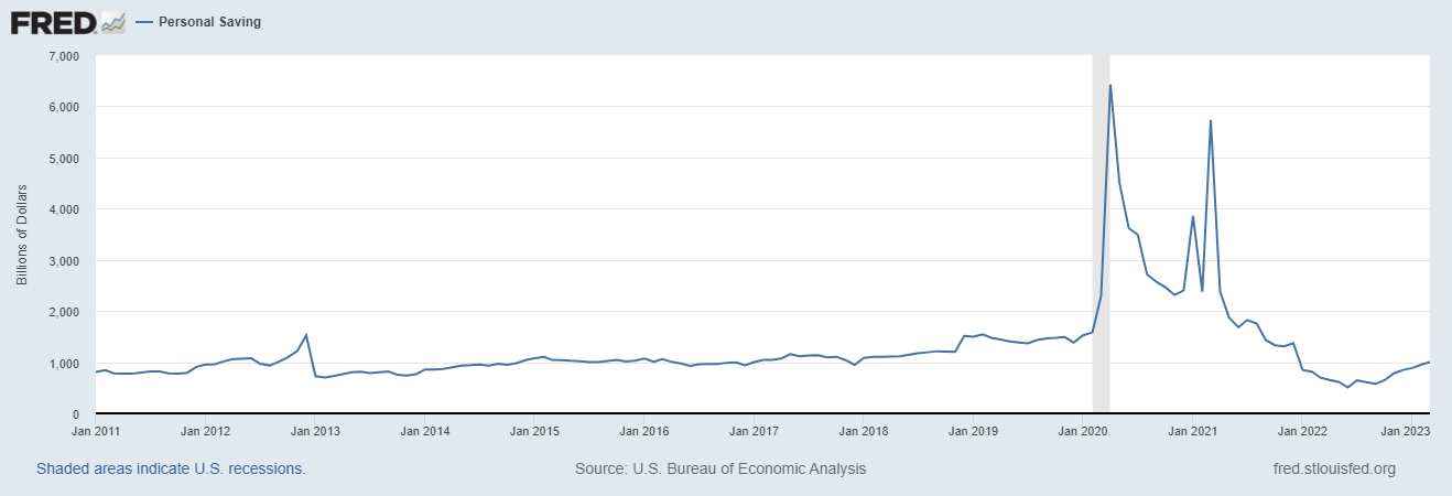 According to the Bureau of Economic Analysis, personal income increased $67.9 billion or 0.3% in March 2023. Disposable personal income (DPI) increased $71.7 billion or 0.4%, and personal consumption expenditures (PCE) — also the target that the Federal Reserve manages its current interest rate policy — was at $8.2 billion or less than 0.1%. A simple translation to these figures means that private sector wages and salaries are still rising. This increase in compensation has contributed to a rise in disposable income (the residual money left over after household liabilities paid) has pushed personal savings back to $1 trillion, a 16% increase from personal savings levels at the end of 2022.