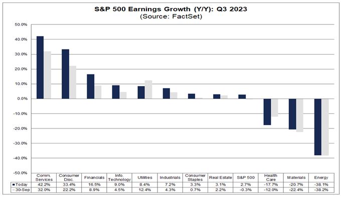 Below are the eleven sectors of the S&P 500 and their earnings growth on a YoY basis at the midpoint of the Q3 earnings season.