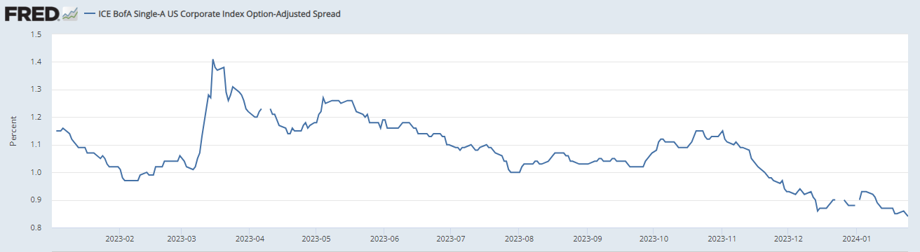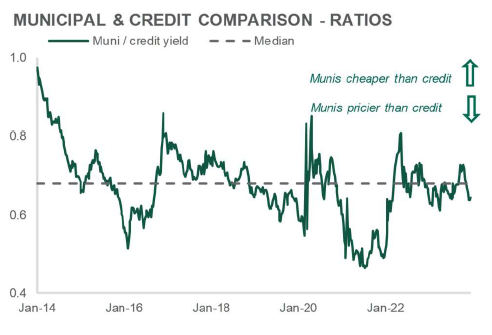 Municipal bonds may not receive much attention as they are typically utilized by individuals in the top tax bracket. However, they can be incredibly useful for generating safe tax-free yield. Nationally, Munis returned 6.4% in 2023, with 7.9% of that return occurring between October and December. The chart below indicates that Munis have become relatively expensive compared to corporates or treasuries after the significant run-up in the fourth quarter. If you already hold Munis, that is great, but it may be wise to invest new funds gradually through dollar-cost averaging.