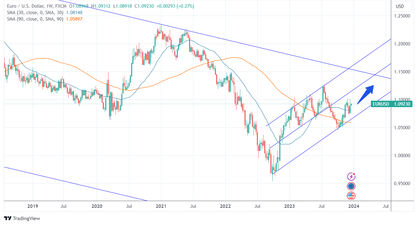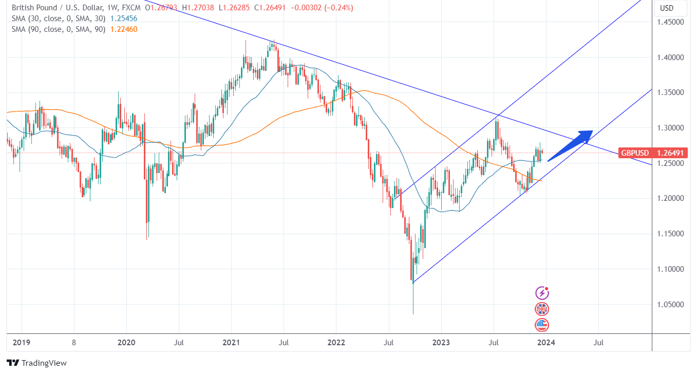 EUR/USD is still in a bearish phase, and until the technicals change that is my longer-term view. Short term I look for EUR to trade sideways to bullish on risk as market players focus on rate cuts, which are historically negative for the dollar. The Ukraine-Russia war, inflation and energy prices have weakened the Eurozone more than the U.S. economy that has been surprising resilient in 2023. The question remains on the U.S. economy in 2024 if it remains strong. The waiting game is on for interest rates that should see Europe blink first as cuts are expected in Q2 next year. ECB President Christine Lagarde said in November that “even having a discussion on a cut is totally, totally premature.” Rate cuts in the U.S. will matter most anyway and they could occur as soon as Q2 or possibly Q3. From there we might see EUR buying surpassing USD toward 1.16. It is too early to tell as 2024 election unknowns provide too many risks where we could see flight in dollars for safety.