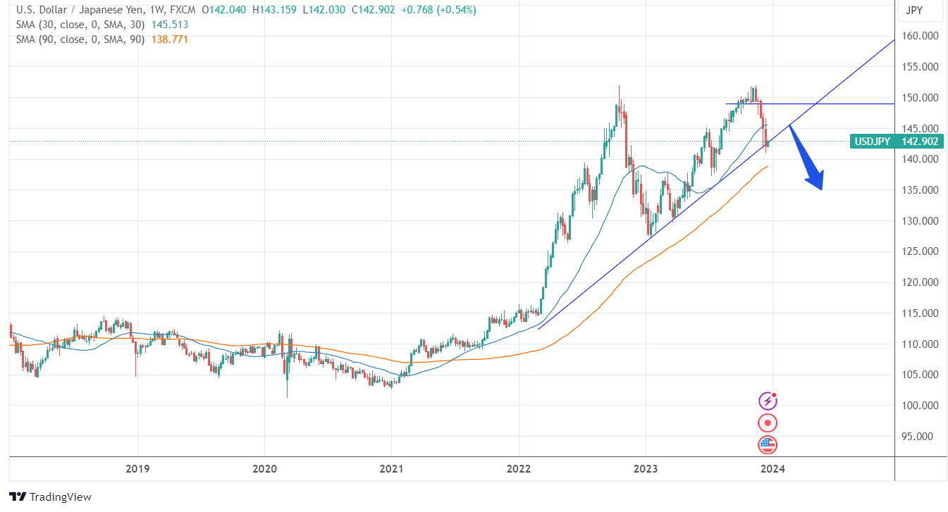 The long-term bullish trend for the dollar versus the yen is starting to show cracks. The Fed announcing cuts next year should keep 150 level protected for now, which held without any direct manipulation from the Bank of Japan this time. In addition, the BoJ will make a move away from sub-zero rates by January 2024. This could see a rapid move to 135 and possibly to lows of 2023 near 127. If growth slows in the U.S. as expected, there should be a move out of the “carry trade” as rate cuts in the U.S. for next year should mean dollar weakness. The Fed now looks to be the driver of USD/JPY lower into 2024 and not the Bank of Japan. The outlier here is the Japan economy and the effect of long term zero rates failed to produce growth. A rising rate environment should curtail growth and produce more challenges for the economy as it creates a repatriation of funds back to Japan. The carry trade that has occurred for over a decade could unwind and cause a great deal of volatility in 2024.
