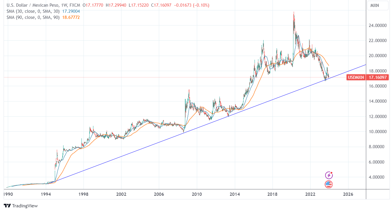 The long-term monthly chart is looking bearish as moving averages crossed back in June. Chart technicals are looking like additional gains for the peso can be achieved if long-term support line breaks. More price separation from the moving averages could target a move to 15.0000 area in early 2024. On the macro side there is support for this as labor cost in Mexico is 20% cheaper from that of China. Also skilled labor in Mexico is far superior to that in China, promoting further influx of capital. The politics also favor growth in Mexico, as evidence we have seen more businesses in our footprint move away from doing business in China due to tariffs, politics surrounding COVID-19, slavery in Xinjiang and aggression toward Taiwan.