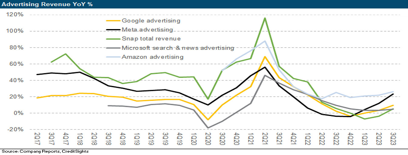 Digital Ad spend rates for social media and search giants like Alphabet, Meta, Snap, TikTok and Amazon should accelerate into 2024, after the immediate pullback in spending following the initial COVID-19 shock. Since then, there has been a strong recovery in ad spend rates. Meta has seen the sharpest acceleration to its YoY growth rates, followed by Google and Amazon. Visibility beyond a few quarters continues to be murky, though, since digital advertising is extremely sensitive to economic cycles. There are some secular tailwinds, though, as digital advertising continues to grow as a percentage of total advertising dollars. Also, Generative AI can drive advancements in the creation and distribution of personalized digital advertisements, increasing customer ROI. With all that said, MAGNA forecasts Digital Pure-Play global ad revenue (69% share of total ad spend) to have +10.5% growth in 2023 and +9.4% growth in 2024.