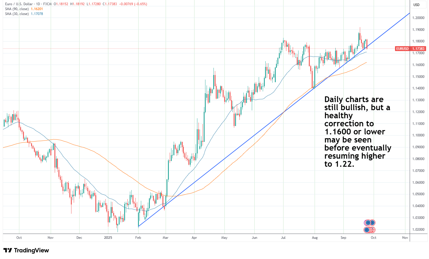 After the FOMC cut rates in September by 25 BP, EUR/USD broke above 1.19 for the first time in exactly four years. Russia first started mobilizing tanks on the Ukraine and Crimea border in March of 2021, which led to the first wave of Euro selling versus the dollar that year when Euro was trading at 1.21. After the February 2022 invasion, the Euro ultimately sold off to .9550 and has been in a recovery since. The Eurozone has been ahead of the U.S. in its rate-cutting cycle and experiencing low growth and an increase in tariffs on goods. The approach by ECB President Christine LaGarde is expected to be cautious and data driven going forward with inflation now more under control. The U.S. is expected to do two more cuts this year and possibly one more early in 2026, which will keep pressure on the dollar selling. Unless there is a severe U.S. downturn or global crisis to create flight into dollars, we could see the Euro trade to 1.22 by year-end. Downside support is now at 1.16 and 1.14, which would need to break to reverse a weak dollar bias.