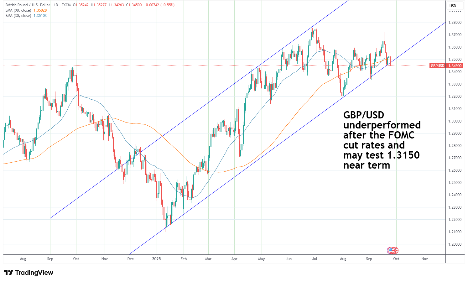 The Federal Reserve Board cut interest rates by 25 basis points (BP) this week with only one Federal Open Market Committee (FOMC) member in opposition. “You can think of this, in a way, as a risk management cut,” said Chair of the Federal Reserve, Jerome Powell, during a press conference. He added that a “very different picture” of risks has emerged as the labor market has begun to cool off versus the threats on the inflation front. Powell believes costs have been put in check because businesses are absorbing the cost, but over time those impacts will be inflationary and passed onto consumers. The Fed is on schedule to make two more cuts before year end, and the dot plot is above 50% for another one in early 2026. The forward-looking equity markets rallied, believing cuts will increase loan and business growth. The dollar also weakened broadly initially before rallying yesterday. U.S. President Donald Trump has been vocal for the Fed to cut, as it not only increases lending and business activity, but it reduces the interest the U.S. has pay on debt. Theoretically, the U.S. government saves $92.5 billion for every 25 BP of rate cuts, so that number jumps to $370 billion with four cuts. That savings along with the estimated $300 billion the U.S. expects to receive in tariffs is a windfall for the government.