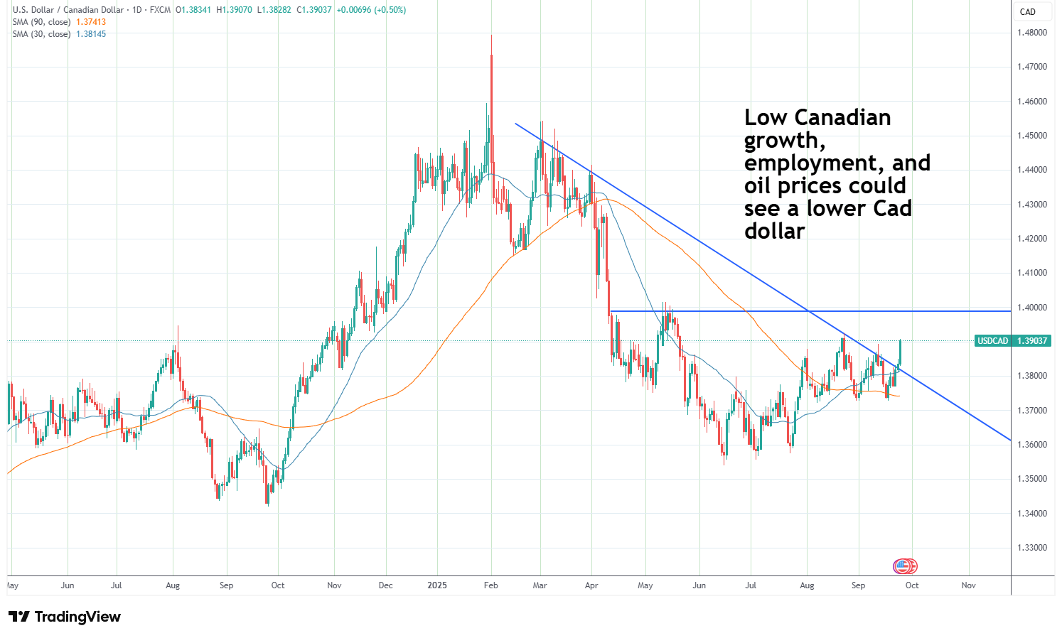 The Bank of Canada cut rates 25 BP as growth and employment both point to a fragile and slowing economy. GDP dropped by 1.6% in the second quarter and exports dropped 27% due to U.S. tariffs. Canada dropped a whopping 65,000 jobs while the unemployment rate spiked to 7.1%. The inflation rate remains under 2%, which will pave the way for future rate cuts. Canada’s main export is oil. It has suffered as prices have declined since Trump has been in office and promised to expand supply. USD/CAD after having extreme volatility when Trump implemented tariffs globally, has been range bound since May. Lower oil prices and more Bank of Canada rate cuts could see a weaker Canadian dollar into year-end. Trend resistance is now above 1.400.